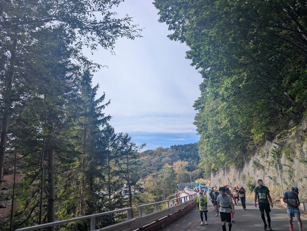 覚悟はしていたものの、思った以上にきつく、どんどん脚が上がらなくなってきます。周りでは歩いている人が結構多く、私も途中からは歩いて体力を温存しました。この段階で既に脚に疲労感が‥。