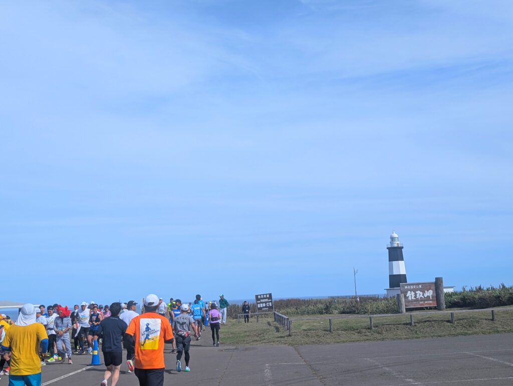 12kmを過ぎると本大会のハイライトである能取(のとろ)岬。オホーツク海を一望できるパノラマビューが広がり、「網走に来てよかったー!」と感じられるポイントです。海をバックに写真を撮り、本大会の目的一つ目を達成。