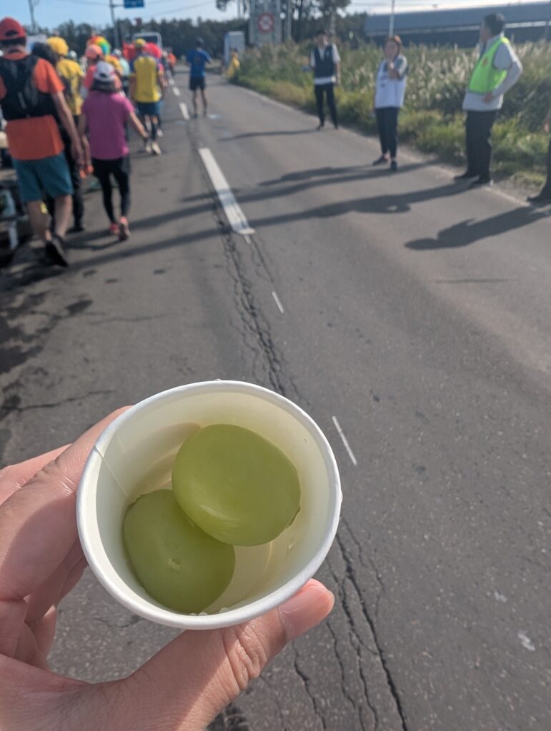 35km地点で第三関門が設けられています(制限時間:5時間20分、必要ペース(目安):9分10秒/km)。ここでは最後の補給のシャインマスカットを頂きました。網走市と観光物産友好都市として交流のある、山形県天童市産だそうです。