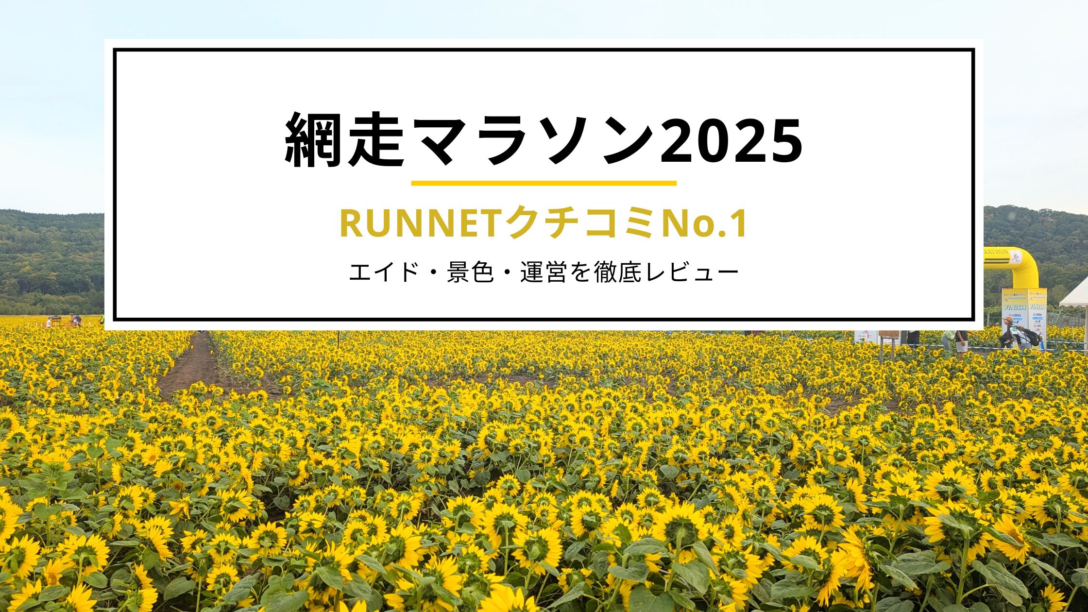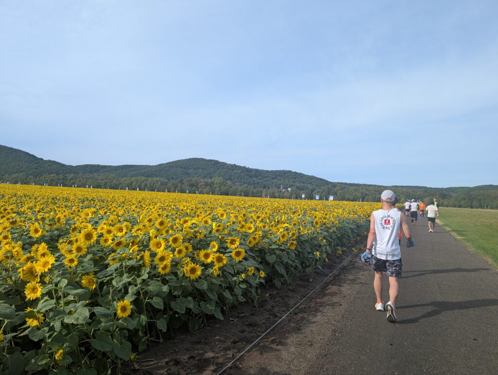 ついに42.195kmを走り切り、ひまわり畑に囲まれてゴール!三つ目の目的を達成。やり切った‥!