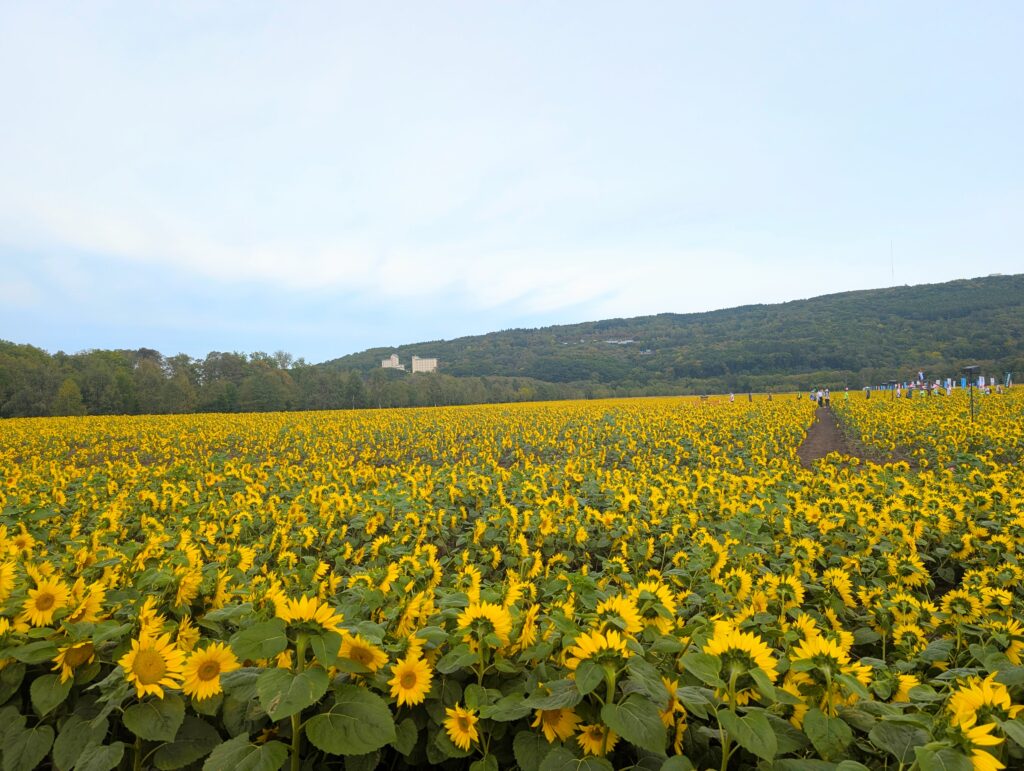 辺り一面見渡す限り黄色の絨毯が広がっていて、この景色を見た瞬間「ついにここまで来た‥!」と泣きそうになりました。だけど、ひまわり畑に入ってからゴールまでが結構遠くて、感動しつつも道のりが長く感じました。