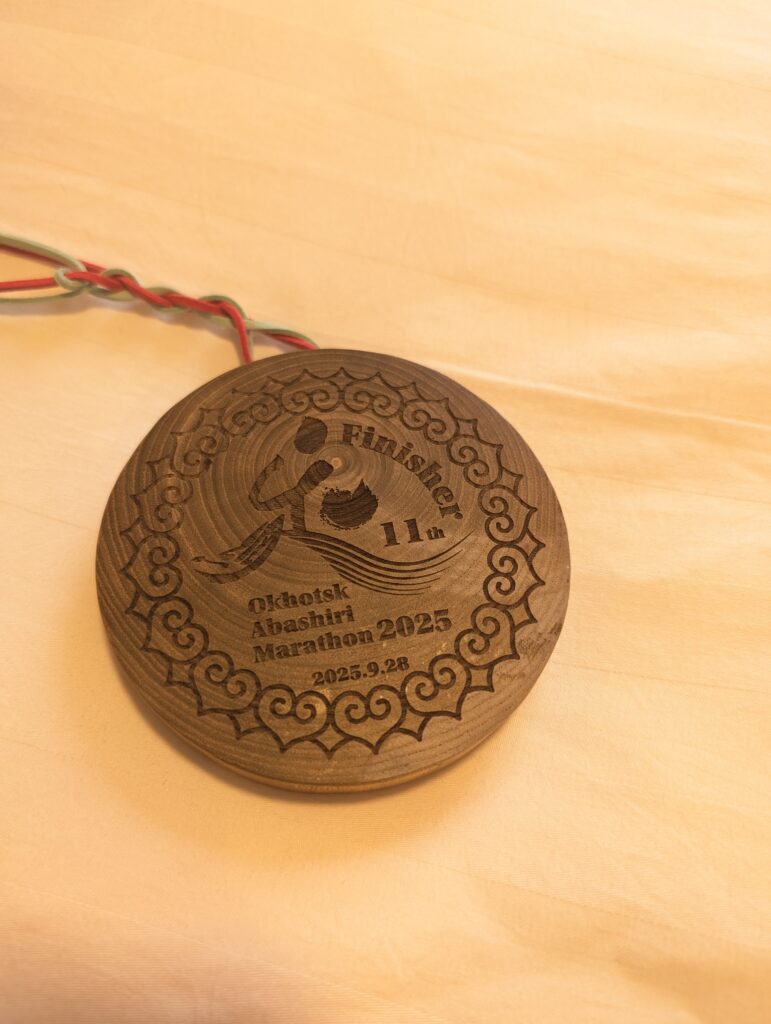完走賞はフィニッシャータオルと木製メダル。