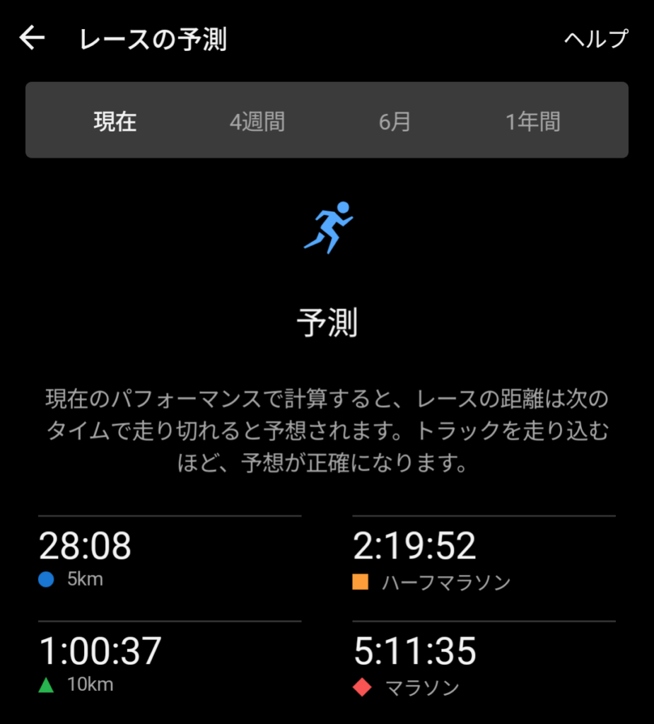 5km、10km、ハーフ、フルの予測タイムを自動算出してくれます。